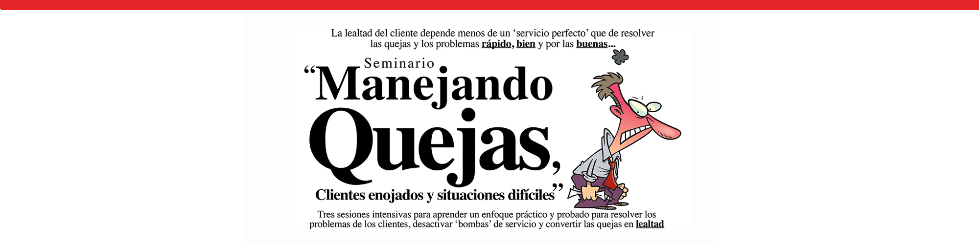 Service Quality Institute, el líder global en Estrategia de Servicio, presenta el seminario "Manejando QUEJAS, clientes ENOJADOS y situaciones DIFÍCILES": tres sesiones intensivas para aprender un enfoque práctico y probado para resolver problemas de los clientes, desactivar ‘bombas’ de servicio y convertir las quejas en LEALTAD. Para más información: www.ManejandoQuejas.com